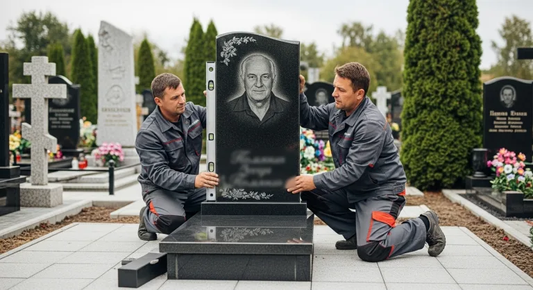 Аккуратная и надежная установка всех элементов мемориального комплекса: стелы, подставки, цветника, ограды. Уважительное отношение к месту работы.