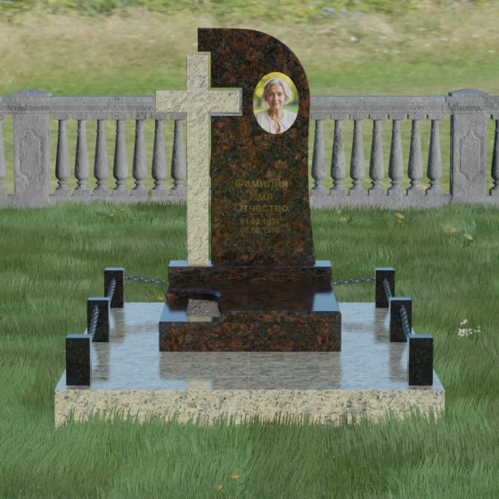 Каждый элемент этого надгробия несет в себе скрытый смысл. Высокий крест, интегрированный в саму структуру камня, выступает символом духовного покровительства и незыблемой веры. Асимметричная форма стелы олицетворяет жизненный путь, который никогда не бывает абсолютно ровным, но всегда стремится вверх, к свету. Массивное основание и каменное ограждение с цепями символизируют крепость семейных уз и нерушимую границу между суетным миром и вечным покоем. Эта форма вызывает чувство защищенности и монументальности, подчеркивая, что память о дорогом человеке так же тверда и вечна, как сам гранит.