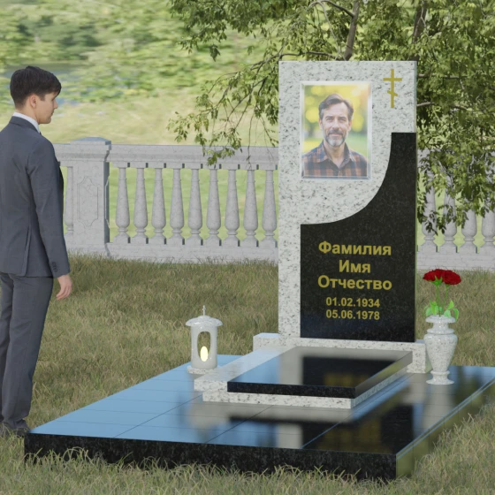Модель Артикул 024 представляет собой законченное архитектурное решение. Стела установлена на массивный гранитный цоколь, который служит надежным фундаментом и придает всей конструкции необходимую устойчивость. Важной особенностью данного проекта является полное мощение участка: вместо открытого грунта используется сплошная надгробная плита. Это не только создает эстетически безупречный, аккуратный вид, но и значительно упрощает уход за местом захоронения, избавляя от необходимости борьбы с сорняками. В едином стиле с основным монументом выполнены дополнительные элементы декора: изящная каменная ваза, установленная на плите, позволяет приносить живые цветы, сохраняя гармонию композиции. Каменный бордюр по периметру участка четко очерчивает границы мемориала, превращая его в уединенное место для тихой молитвы и воспоминаний.