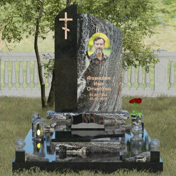 Данное ритуальное изделие представляет собой выразительную художественную композицию, построенную на гармонии двух различных фактур и форм. Выбор этой модели обусловлен её глубоким символизмом: асимметричное разделение стелы на две части олицетворяет земной и небесный пути. Левая часть, выполненная в виде строгого вертикального столпа из насыщенного цветного гранита, служит основанием для объемного православного креста с детально проработанным распятием. Правая же часть, имеющая мягкий, плавный изгиб верхней грани в форме волны, создает идеальное пространство для размещения портрета и памятных слов. Сочетание строгой геометрии и лиричного изгиба позволяет выразить всю многогранность чувств — от глубокой скорби до светлой памяти.