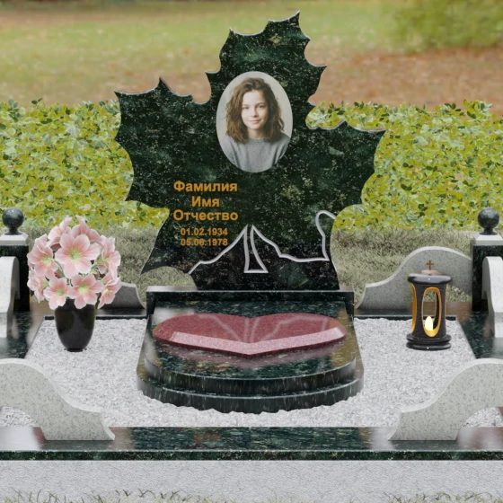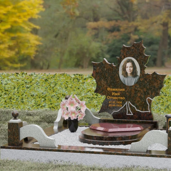 Данная мемориальная композиция — это воплощение глубокого уважения и вечной памяти, облаченное в художественную форму. Выбор формы кленового листа не случаен: в мировой символике он олицетворяет силу духа, красоту жизненного пути и мудрость. Каждая линия этой стелы пропитана эстетикой природного изящества. Резные края листа выполнены с филигранной точностью, создавая сложный, многогранный силуэт, который выделяется на фоне классических строгих форм. Плавные изгибы и отсутствие агрессивных углов призваны дарить чувство покоя и умиротворения, подчеркивая, что душа близкого человека обрела вечный приют в гармонии.