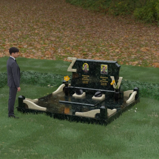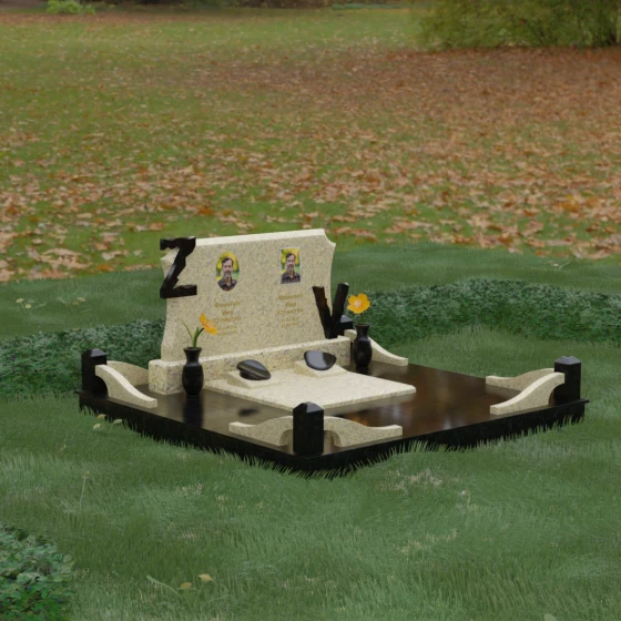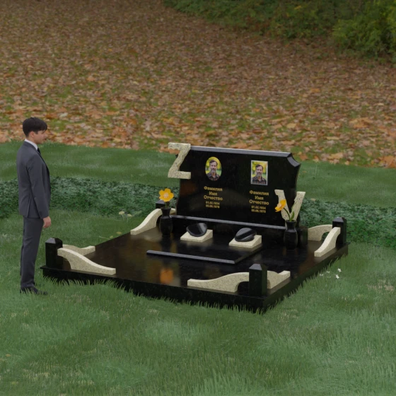 Данная мемориальная композиция включает в себя полное благоустройство участка, что избавляет от необходимости дополнительного оформления. Основанием служит высокий гранитный цоколь, обеспечивающий устойчивость и долговечность всей конструкции. Территория полностью закрыта монолитными надгробными плитами с зеркальной полировкой — это не только придает захоронению величественный вид, но и значительно упрощает уход, предотвращая рост сорной травы и скопление влаги.