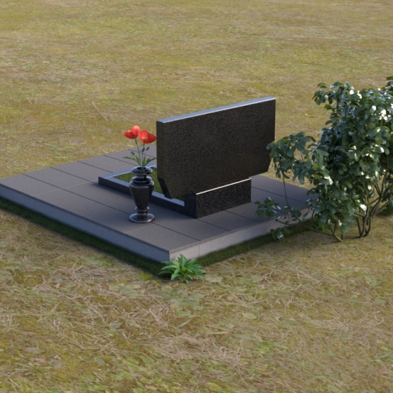 Особое внимание привлекает контраст между полированной поверхностью и матовым срезом камня на боковых гранях. Эта игра фактур создает дополнительный объем и подчеркивает геометрию монумента. Сдержанная, но выразительная форма вазы, выполненная в том же черном граните, гармонично дополняет композицию. Ее плавные линии и классические пропорции создают ощущение умиротворения и покоя.