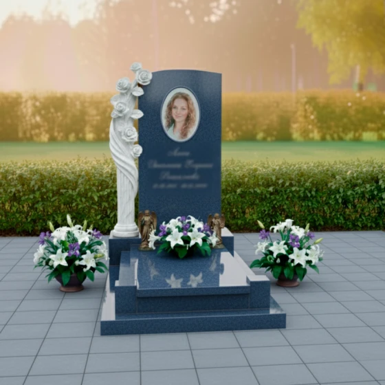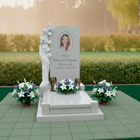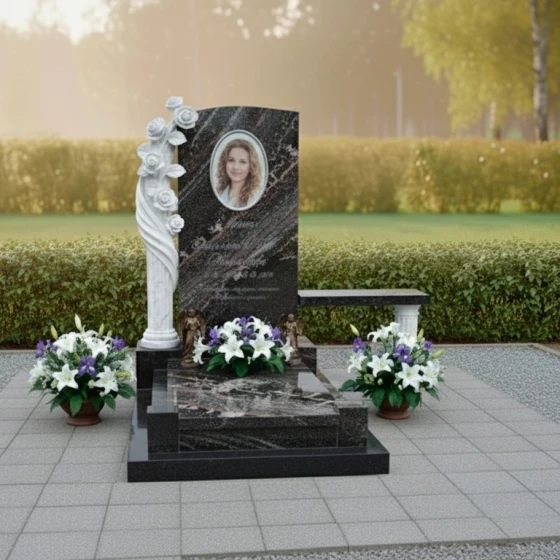Центральный элемент композиции — строгая, но при этом изысканная стела, выполненная в форме элегантной арки с мягким, округлым верхом. Ее грани тщательно отполированы до зеркального блеска, создавая глубокий черный фон, который идеально контрастирует с нежностью и чистотой резных элементов. Слева от стелы возвышается потрясающая скульптура, изображающая пышную ветвь роз. Каждая роза, от бутона до полностью раскрывшегося цветка, вырезана с удивительной детализацией: видны тонкие лепестки, их изящные изгибы и нежная фактура. Белый цвет камня, из которого выполнена скульптура, подчеркивает ее воздушность и чистоту, создавая пронзительный контраст с темным гранитом стелы. Этот контраст между глубокой полировкой и матовой, светлой фактурой резных элементов придает монументу особую выразительность и объемность, символизируя переход от земного к вечному, от скорби к светлой памяти.