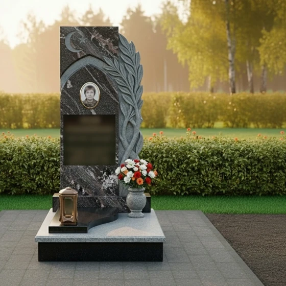 Центральная стела, выполненная в форме вертикального прямоугольника с выразительными асимметричными элементами, сразу привлекает внимание. Ее левая грань обработана с идеальной полировкой, создавая зеркальную поверхность, в которой отражается окружающий мир, символизируя бесконечность бытия. В верхней части стелы расположен изящный полумесяц со звездой, вырезанный с особой тщательностью, что придает памятнику глубокий религиозный смысл и подчеркивает индивидуальность усопшего. Ниже этого символа, в углублении, напоминающем стрельчатую арку, помещена овальная фотокерамика с портретом, обрамленная тонким рельефным кантом, что придает изображению особую значимость и защищенность.