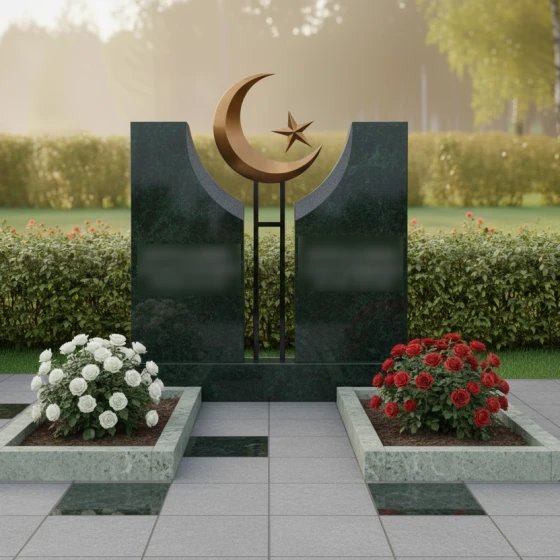 Данное ритуальное изделие представляет собой величественную парную композицию, воплощающую идею неразрывной духовной связи и вечного покоя. В центре художественного замысла находятся две вертикальные стелы, симметрично расположенные друг относительно друга. Их строгая геометрия смягчена изящными вогнутыми фасками во внутренней части: мастера-камнерезы ювелирно выбрали камень, создав идеальную полукруглую нишу. В этом пространстве, словно паря над землей, установлен главный символ веры — объемный полумесяц со звездой. Сочетание природного камня и металлического элемента подчеркивает статус захоронения и придает всей конструкции торжественный, одухотворенный вид.