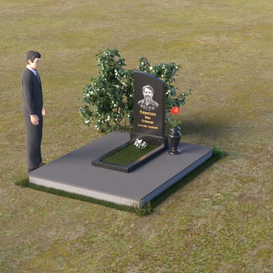 Взгляд невольно приковывает стела, выполненная в форме элегантной арки. Ее верхняя часть, скругленная мягким полумесяцем, словно устремляется ввысь, символизируя духовность и надежду. Лицевая поверхность стелы отполирована до зеркального блеска, отражая свет и создавая ощущение глубины. На ней искусно выгравирован портрет, выполненный с высокой детализацией, позволяя сохранить образ дорогого человека. Ниже располагается надпись, выполненная золотыми буквами, которые ярко выделяются на фоне черного гранита, словно светлые воспоминания, пробивающиеся сквозь время.