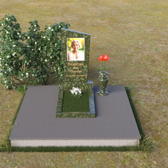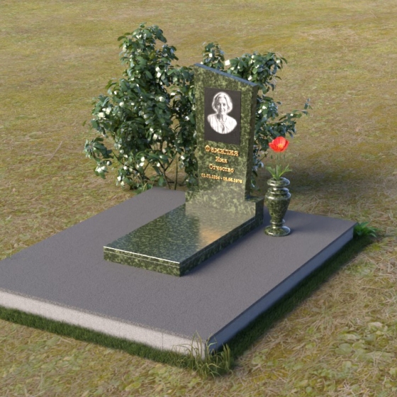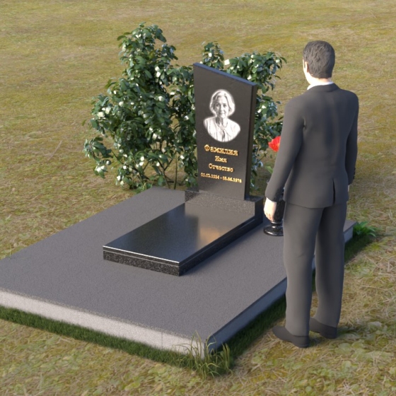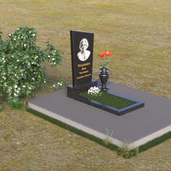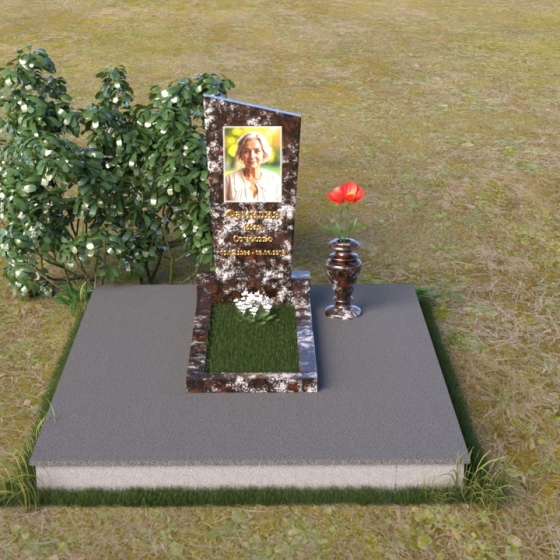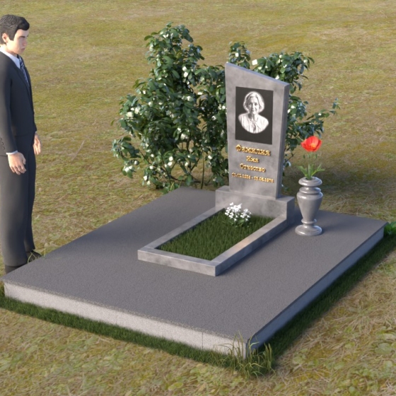 Мемориальная композиция состоит из нескольких элементов, каждый из которых тщательно продуман и выполнен с безупречным качеством. Начинается все с основания – широкой, массивной плиты, которая обеспечивает устойчивость всей конструкции. Её матовая, слегка шероховатая поверхность призвана оттенять блеск полированных элементов, создавая игру фактур и контрастов. Далее взгляд переходит к горизонтальной стеле, расположенной на постаменте. Она выполнена в виде прямоугольника с плавными, скругленными углами, что придает ей мягкость и элегантность. Поверхность стелы отполирована до зеркального блеска, отражая небо и окружающий мир, словно напоминая о связи между земным и небесным. На постаменте возвышается вертикальная стела с портретом и надписью. Верхняя часть стелы имеет скошенный угол, что добавляет динамики и оригинальности всей композиции. На стеле выгравированы имя, фамилия и отчество усопшего, а также даты жизни, выполненные изящным шрифтом. В правом углу композиции расположена ваза, предназначенная для цветов. Её классическая форма и полированная поверхность гармонично дополняют общий стиль мемориала.