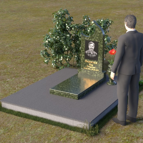 Этот гранитный монумент притягивает взгляд своей необычной формой. Основной элемент – вертикальная плита, увенчанная плавной, асимметричной дугой, напоминающей полумесяц. Её левая сторона чуть выше правой, что создает ощущение динамики и незавершенности, словно оборвавшейся жизни. Поверхность лицевой стороны отполирована до зеркального блеска, отражая небо и окружающий пейзаж, создавая иллюзию глубины и пространства. На полированной поверхности выгравирован портрет усопшего, надпись с именем и датами жизни. Нижняя часть монумента, сопрягаясь с горизонтальной плитой, образует единый ансамбль. Переход между вертикальной и горизонтальной плоскостями подчеркнут небольшой ступенькой, добавляющей конструкции объема. Горизонтальная плита, в свою очередь, также отполирована до блеска, отражая свет и усиливая эффект монументальности. Фаски на гранях плиты аккуратно обработаны, что придает памятнику завершенный и элегантный вид. Сбоку от монумента расположена небольшая гранитная ваза, предназначенная для живых цветов, которые станут символом вечной памяти и любви.