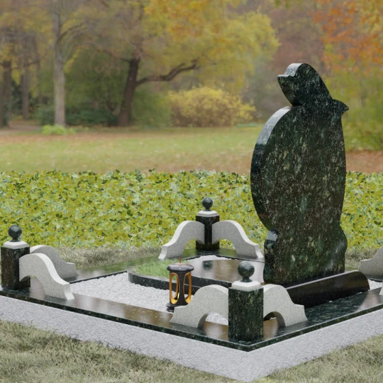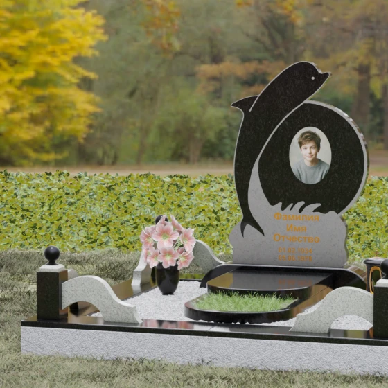 Этот гранитный монумент представляет собой не просто мемориальный знак, а настоящую художественную композицию, преисполненную глубокого символизма. Центральное место в дизайне занимает фигура дельфина — древнего символа спасения, чистоты и проводника душ в лучший мир. Плавный, динамичный изгиб морского обитателя словно обнимает центральный медальон, создавая защищенное, камерное пространство для портрета близкого человека. Мастера добились удивительной игры контрастов: зеркально отполированное туловище дельфина эффектно выделяется на фоне матовой, детально проработанной резьбы в основании, имитирующей морскую пену и гребни волн.