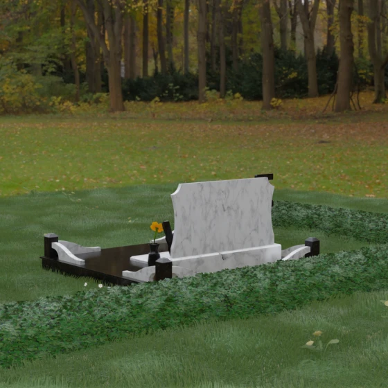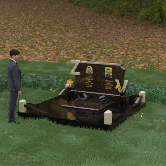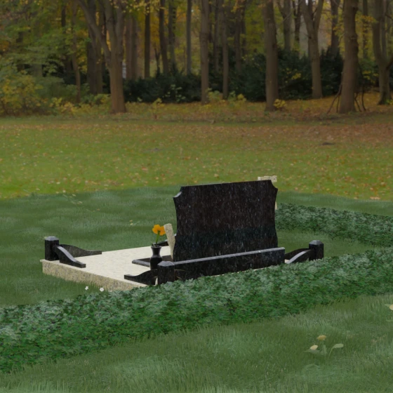 Данная мемориальная композиция включает в себя полное благоустройство участка, что избавляет от необходимости дополнительного оформления. Основанием служит высокий гранитный цоколь, обеспечивающий устойчивость и долговечность всей конструкции. Территория полностью закрыта монолитными надгробными плитами с зеркальной полировкой — это не только придает захоронению величественный вид, но и значительно упрощает уход, предотвращая рост сорной травы и скопление влаги.