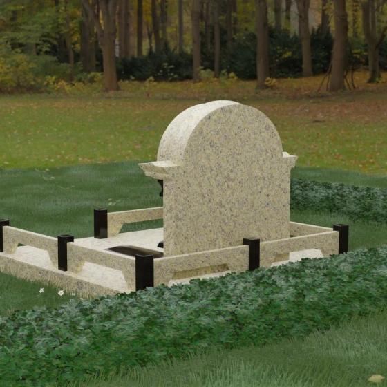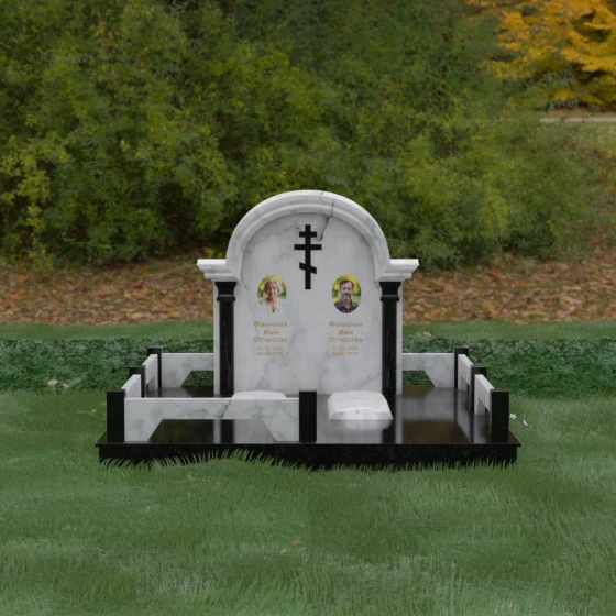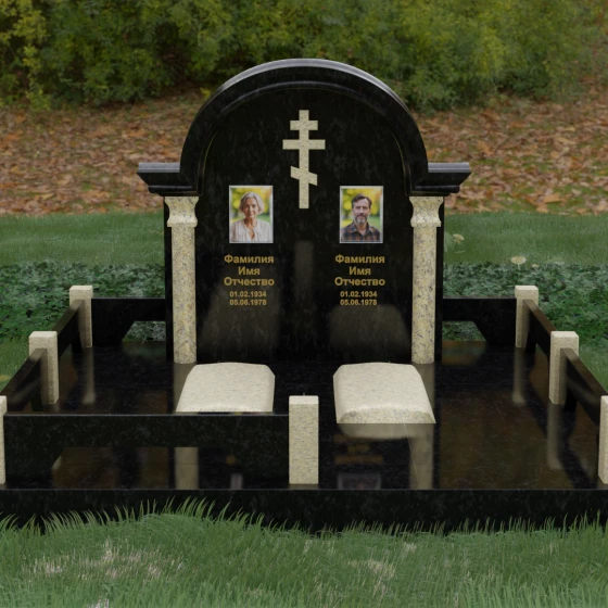 Комбинирование двух контрастных видов камня, как показано на представленных образцах, позволяет выделить ключевые детали: например, сделать светлые колонны на фоне темной стелы или выделить надгробные плиты. Широкая плоскость арки идеально подходит для размещения двух портретов — будь то гравировка или фотокерамика в медальонах. Пропорции стелы позволяют симметрично расположить памятные надписи, сохраняя визуальный баланс и эстетическую гармонию всей композиции.