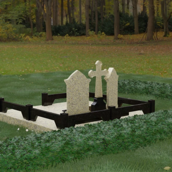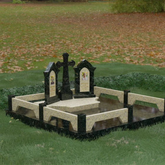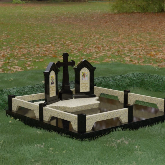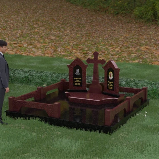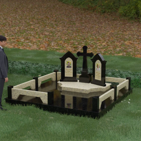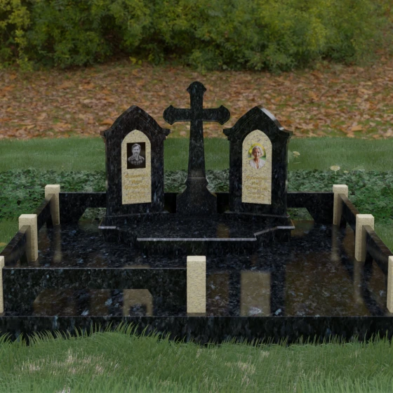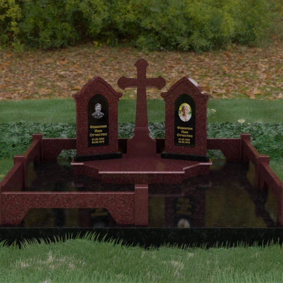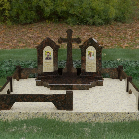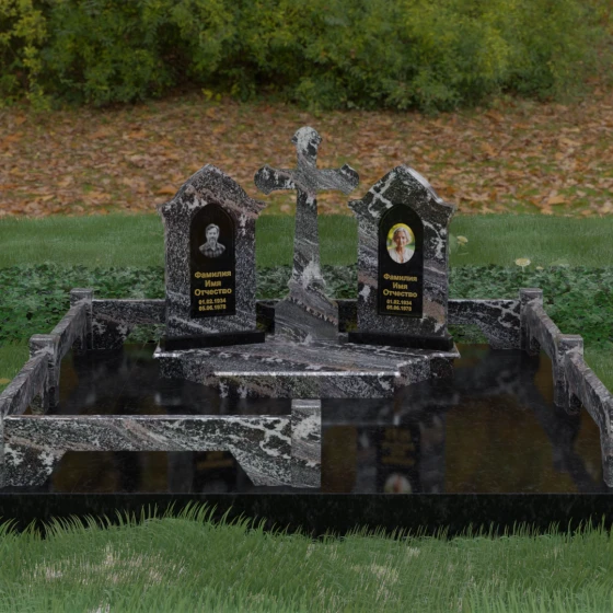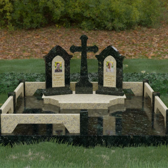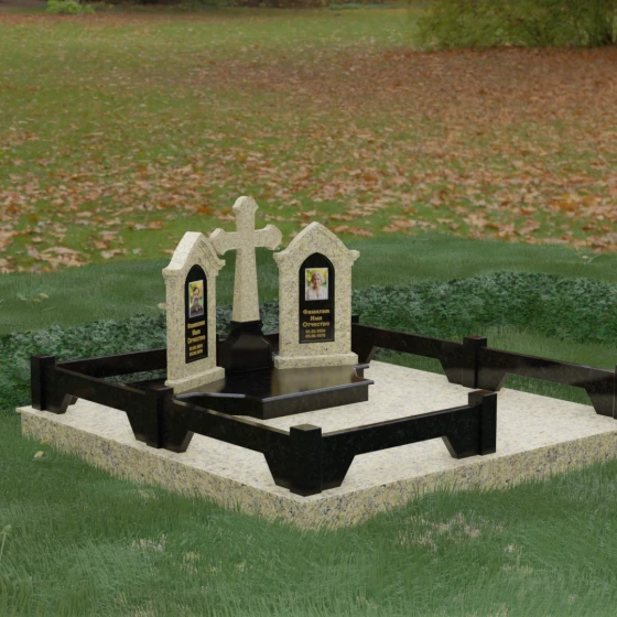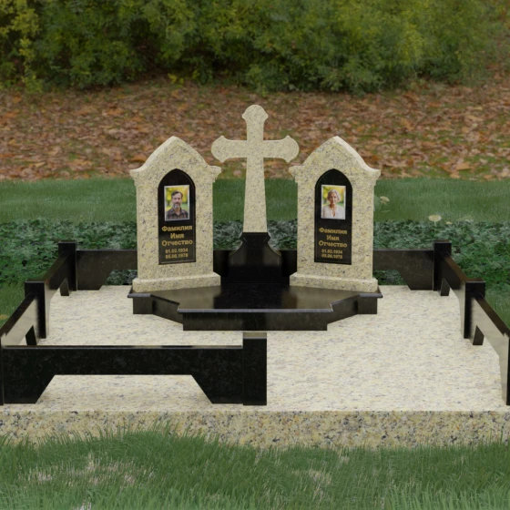 Центральным элементом ансамбля является величественный православный крест, установленный на массивном многоступенчатом постаменте. Его строгие, но изящные линии символизируют духовную опору и веру. По обе стороны от креста расположены две симметричные стелы, выполненные в форме изящных арок. Особенностью данной модели является виртуозная игра контрастов: основные корпуса стел изготовлены из темного, глубоко отполированного камня, в который инкрустированы светлые вставки из натурального гранита. Эти светлые «окна» служат идеальным фоном для портретов и памятных надписей, делая их визуально более легкими и возвышенными.