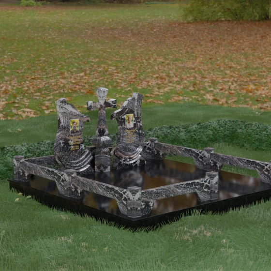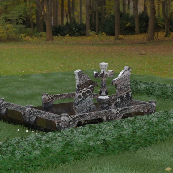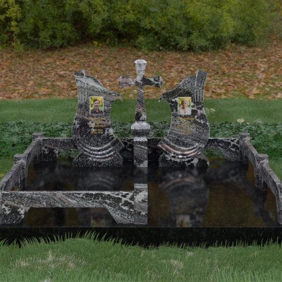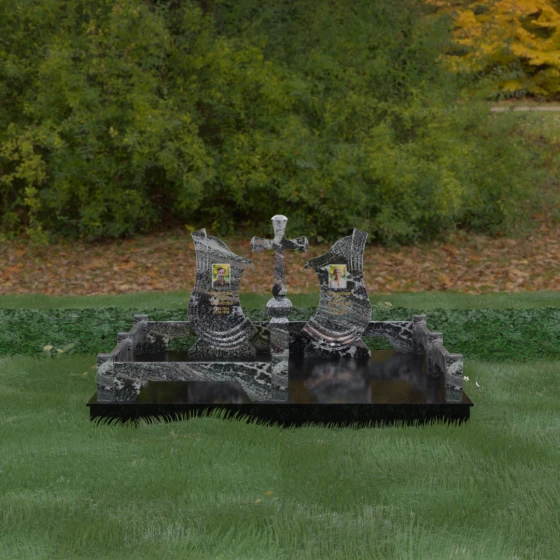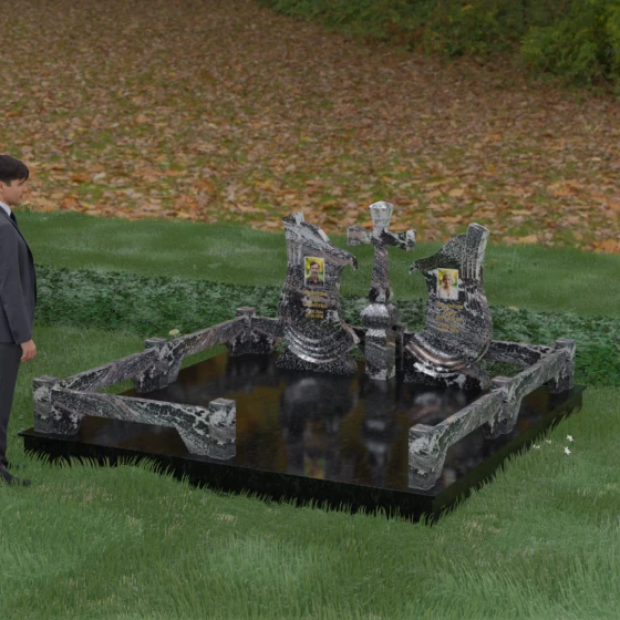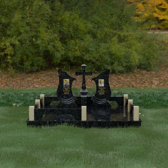 В основе данного ансамбля лежит симметрия, символизирующая неразрывную связь душ и вечный покой. Две стелы, расположенные по обе стороны от центрального элемента, имеют сложную, динамичную геометрию. Их внешние грани напоминают раскрытые крылья или языки пламени, стремящиеся ввысь. Особого внимания заслуживает нижняя часть каждой стелы: каскад глубоких дугообразных борозд создает эффект многослойности и визуальной легкости, превращая тяжелый монолит в парящую конструкцию. Центральным духовным стержнем выступает величественный крест на многоуровневом постаменте. Его формы лаконичны, а сглаженные фаски подчеркивают благородство материала и высочайшее мастерство камнереза.