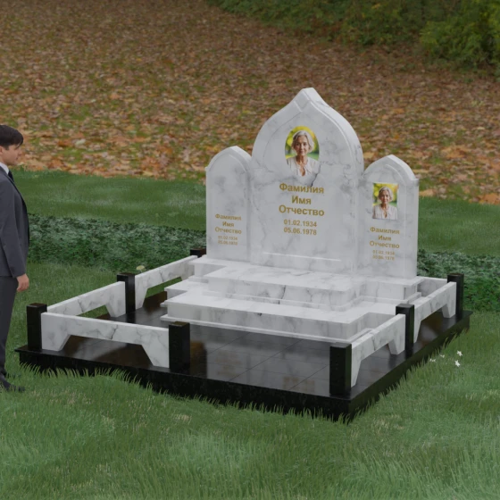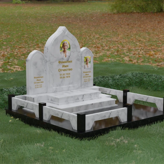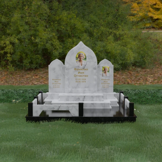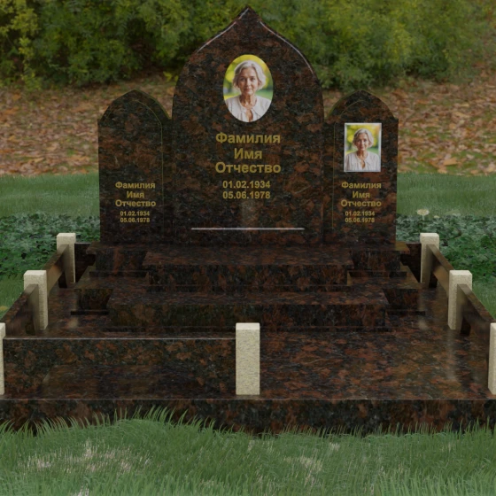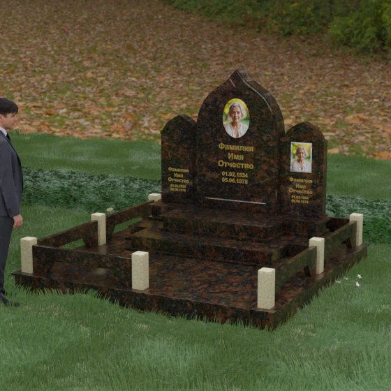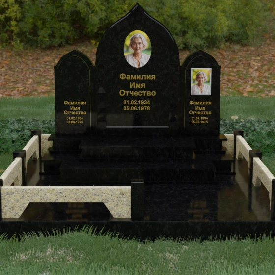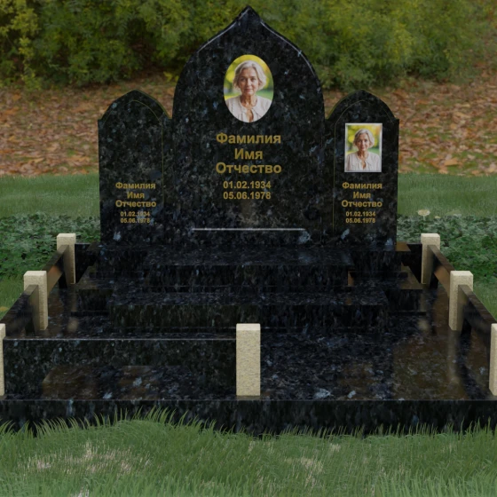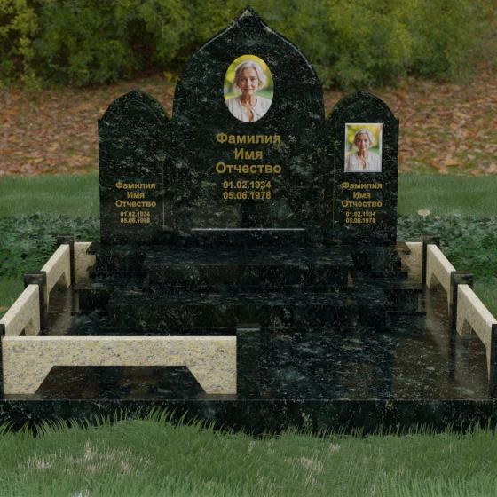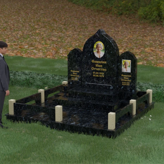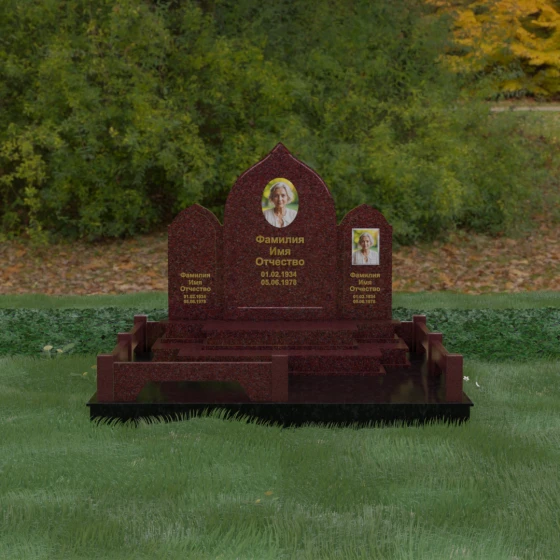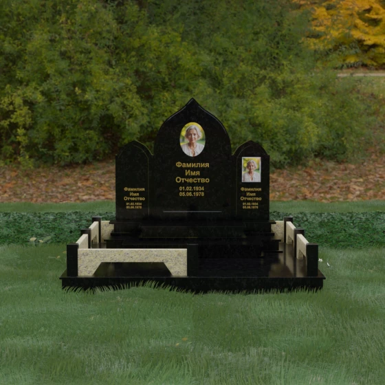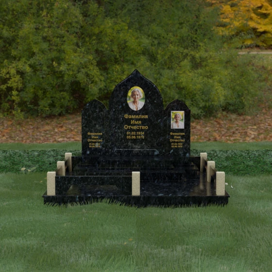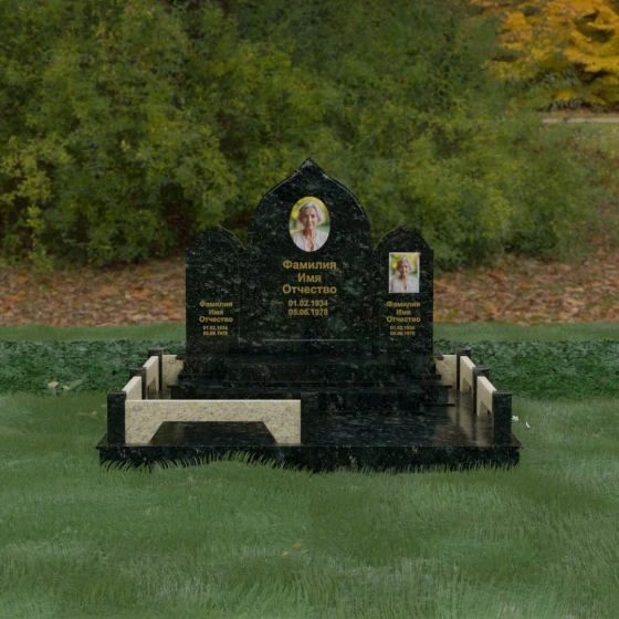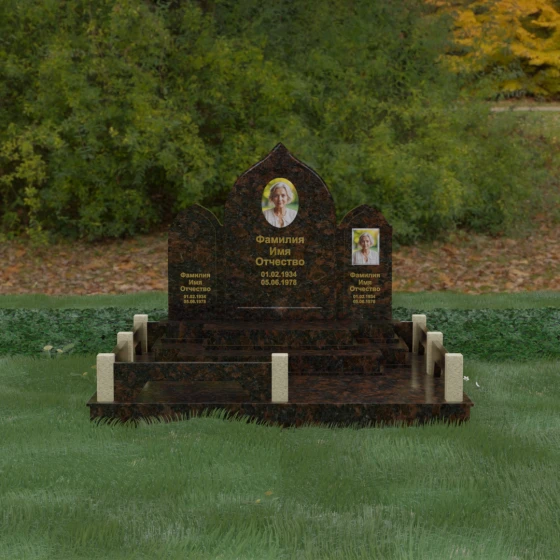 Оформление: Учитывая строгую и одновременно изящную форму арок, мы рекомендуем использовать классическую гравировку с последующим нанесением сусального золота или покрытие «антидождь». Золотистые буквы на темном фоне Габбро-диабаза или Амфиболита выглядят особенно торжественно. Портреты в овальных медальонах или прямоугольная гравировка на боковых стелах будут идеально вписаны в арочное пространство, сохраняя визуальный баланс всей композиции. Четкие линии шрифта подчеркнут архитектурную безупречность комплекса.