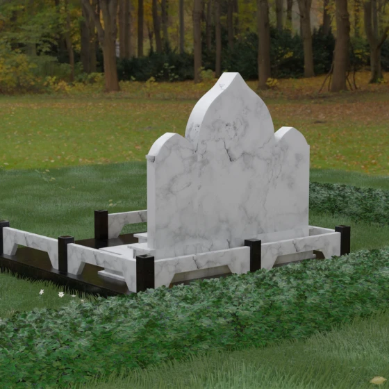 Представленное ритуальное изделие (Артикул 220) — это высокохудожественная композиция, воплощающая в себе архитектурную гармонию и глубокий символизм. Ансамбль выполнен в форме величественного триптиха, где каждая деталь продумана с точки зрения пропорций и эстетического баланса. Центральная стела, венчающая композицию, имеет форму стрельчатой арки, напоминающей очертания церковного купола. Этот изгиб не только придает конструкции духовную возвышенность, но и создает идеальную плоскость для игры света. Боковые стелы повторяют этот мотив, образуя симметричный и завершенный силуэт, который доминирует в окружающем ландшафте, притягивая взгляд своей строгой красотой.