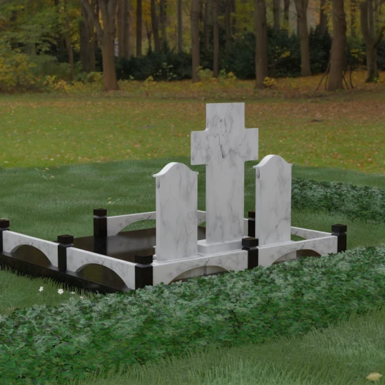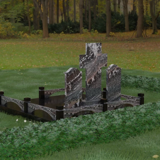 Геометрия этого комплекса наполнена глубокими смыслами. Центральный крест доминирует над всей композицией, выступая как символ надежды и духовной защиты ушедших душ. Парные боковые стелы подчеркивают неразрывную связь между близкими людьми, указывая на то, что их союз продолжается и за пределами земного бытия. Арочные формы ограждения перекликаются с церковным зодчеством, символизируя небесные врата. Отсутствие резких, агрессивных углов в оформлении основных плит настраивает посетителей на смирение и умиротворение, напоминая о том, что смерть — это лишь переход в состояние вечного сна.