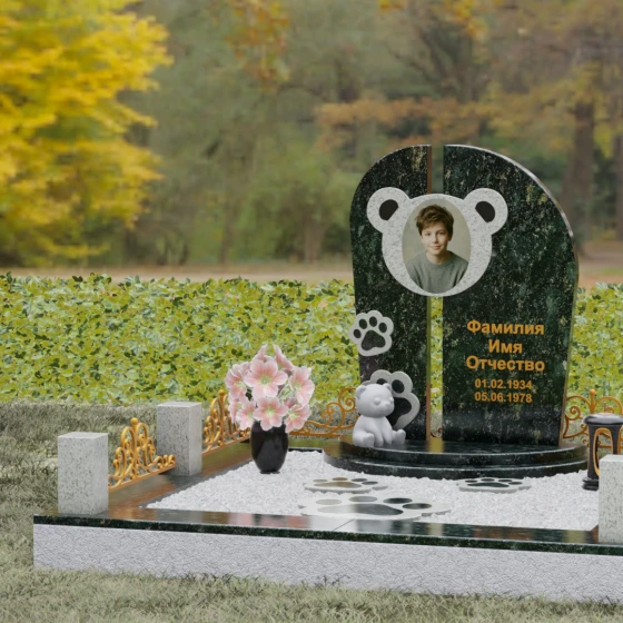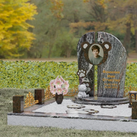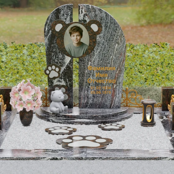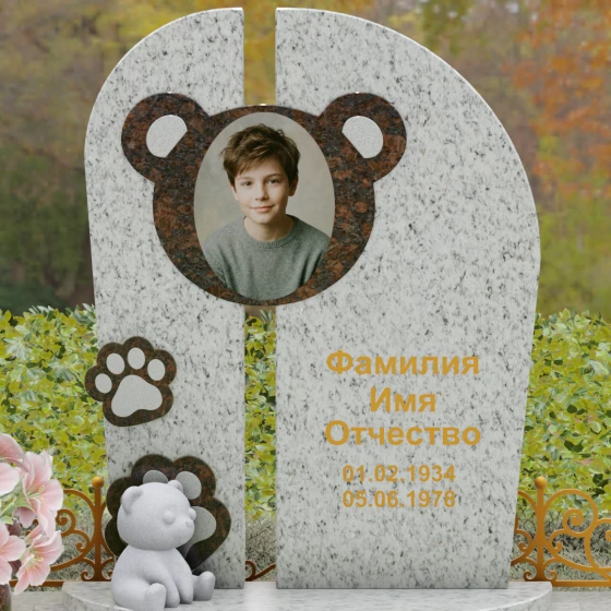 Композиция данного мемориала поражает своей уникальной архитектурой. Центральное вертикальное полотно разделено на две симметричные части узким вертикальным просветом, что создает ощущение легкости и устремленности ввысь, несмотря на внушительный вес камня. Главным художественным акцентом является медальон в верхней части, выполненный в виде стилизованной головы медвежонка. Портрет обрамлен светлой вставкой из благородного гранита, которая выступает над основной плоскостью, создавая эффект мягкого свечения вокруг лика.