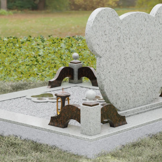 Завершают облик ансамбля функциональные и декоративные элементы: изящная гранитная ваза с плавными изгибами и закрытая каменная лампада, внутри которой мягко мерцает свет. Каждый элемент этой мемориальной композиции, от филигранно выточенных «ушек» до зеркально отполированной надгробной плиты, свидетельствует о глубоком уважении к памяти ушедшего. Это исполненное любви и профессионализма воплощение вечности в камне, которое станет достойным символом памяти, согревающим сердце своей теплотой и совершенством форм.