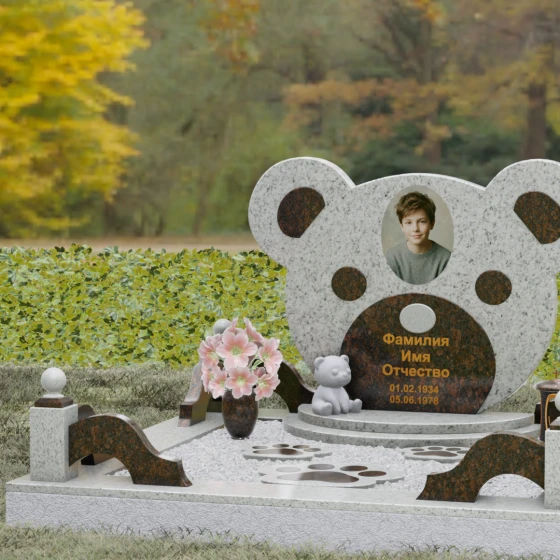 Эта мемориальная композиция представляет собой уникальный художественный проект, созданный для того, чтобы выразить бесконечную нежность и светлую печаль. Главная стела выполнена в форме головы медвежонка — символа чистоты, детства и вечного сна. Плавные, округлые линии силуэта лишены острых углов, что придает изделию визуальную мягкость и умиротворение. Мастера-камнерезы виртуозно передали геометрию образа: симметричные ушки со светлыми вставками и выразительные круглые глаза, созданные методом инкрустации камня другого оттенка. Игра контрастов между глубоким темным основанием и светлым матовым срезом декоративных элементов создает эффект живого объема, заставляя свет играть на полированных гранях и подчеркивая безупречную пластику камня.