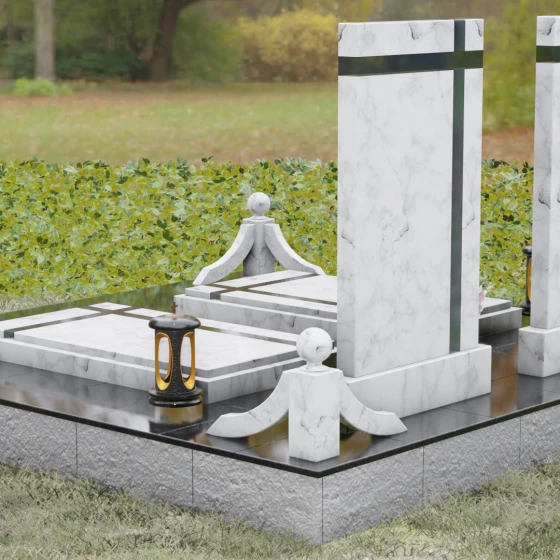Данная величественная мемориальная композиция представляет собой не просто место упокоения, а подлинное произведение архитектурного искусства, призванное увековечить глубокую связь между двумя душами. Дизайн изделия строится на гармонии строгих вертикальных линий и изящных декоративных элементов, создавая атмосферу благородного спокойствия и вечного почтения. В центре ансамбля расположены две симметричные стелы, объединенные общим основанием, что символизирует неразрывность уз и жизненного пути, пройденного рука об руку. Особое внимание привлекает лаконичная резьба в верхней части плит: пересекающиеся глубокие борозды образуют строгий, геометрически выверенный крест. Этот символ веры и смирения не выступает отдельной деталью, а является неотъемлемой частью самого камня, подчеркивая монументальность и целостность всего надгробия.