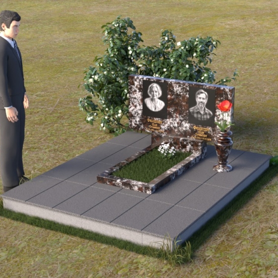 Представленный памятник (артикул ПГ001) являет собой образец строгости и лаконичности, где каждая деталь подчинена общей концепции увековечивания памяти. Композиция состоит из основания, облицованного серыми плитами, горизонтальной плиты, и вертикальной плиты с портретами. Дополнительно предусмотрена тумба для вазы.
