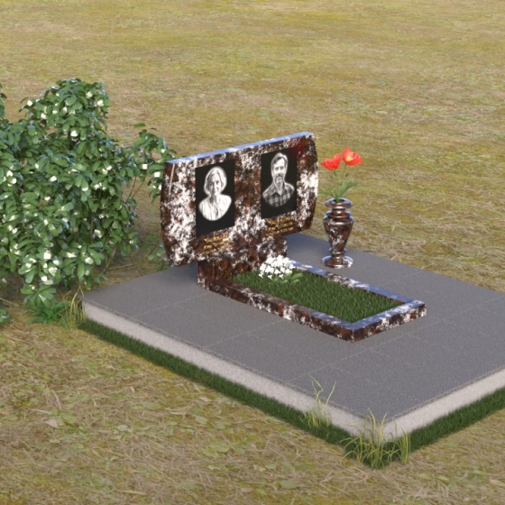 Композиция памятника строится на контрасте строгих геометрических форм и плавных линий, создавая гармоничный и запоминающийся образ. В верхней части возвышается стела из черного гранита, чья зеркальная полировка отражает небо и окружающий мир, словно напоминая о связи земного и небесного. Верхние углы стелы скруглены, смягчая строгость формы и придавая ей более мягкий, человечный облик. На стеле размещены портреты усопших, выполненные с высокой точностью и передающие их индивидуальность. Золотистые надписи имен и дат словно светятся на фоне черного камня, добавляя торжественности и значимости. У подножия стелы располагается горизонтальная плита, также выполненная из полированного черного гранита, создающая ощущение завершенности и устойчивости. Рядом – изящная ваза из того же материала, предназначенная для живых цветов, символа неувядающей памяти и любви.