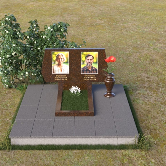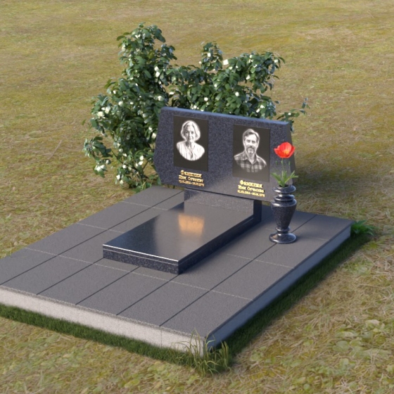 Представляем вам ритуальное изделие – памятник на могилу (Артикул: ПГ018), архитектурное решение, в котором строгость линий сочетается с глубоким символизмом. Это не просто надгробие, а осязаемое воплощение уважения и вечной памяти об ушедшем человеке. Стела, выполненная в форме сдержанного прямоугольника, слегка расширяющегося кверху, символизирует восхождение души к небесам. Грани камня тщательно обработаны, создавая игру света и тени, подчеркивающую монументальность и значимость этого места памяти. Слева и справа, верхние углы стелы имеют элегантные скосы, смягчающие строгость формы и придающие ей утонченность. На зеркальной поверхности камня выгравированы портреты усопших, их имена и даты жизни, выполненные с безупречной точностью и вниманием к деталям. Под портретами располагаются лаконичные надписи, выполненные строгим шрифтом, добавляющие памятнику сдержанности и достоинства. Дополнительная горизонтальная плита, расположенная перед стелой, создает ощущение завершенности и служит местом для возложения цветов или свечей. Этот элемент композиции выполнен в той же стилистике, что и основная стела, поддерживая общую гармонию и пропорциональность мемориального комплекса.