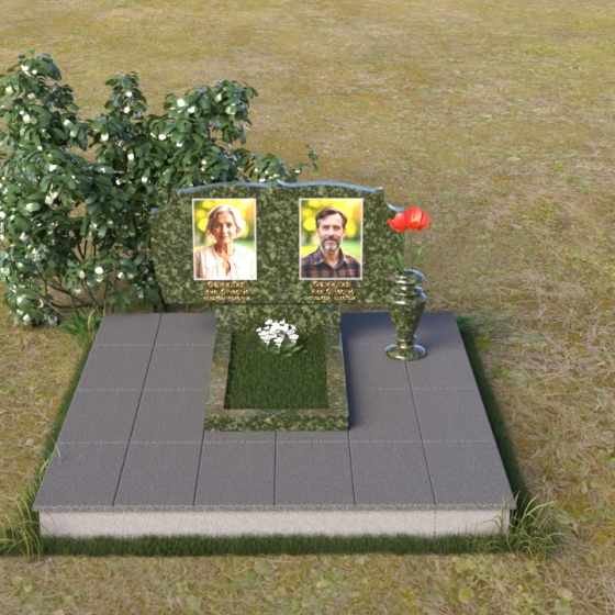 Композиция монумента строится на контрасте плавных линий и строгих геометрических форм. Верхняя часть, несущая на себе портреты усопших, имеет форму, напоминающую раскрытую книгу или свиток, где каждая страница хранит историю жизни. Края этого "свитка" искусно обработаны: верхняя грань словно оплавлена временем, приобретая мягкие, неровные очертания, а боковые стороны имеют более четкий, но все же сглаженный профиль. Фаска, идущая по периметру, придает верхней части визуальную легкость, отделяя ее от основания. Нижняя часть представляет собой прямоугольную плиту с зеркальной полировкой, отражающей небо и окружающий мир, создавая эффект бесконечности и связи с ушедшим. Она словно портал, соединяющий мир живых и мир мертвых, напоминая о непрерывности бытия. Боковины плиты имеют четкую геометрию, подчеркивая основательность и незыблемость памяти.