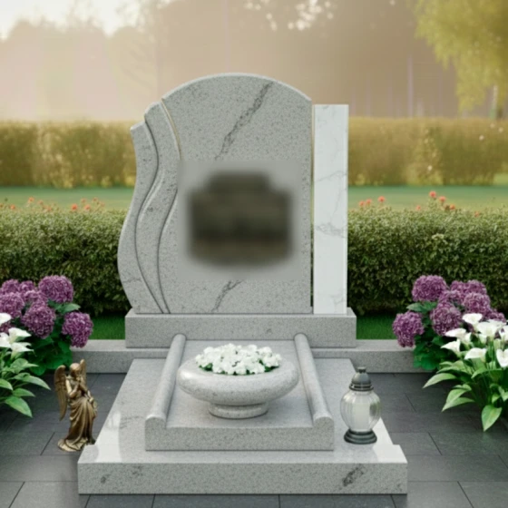 Подножие стелы представляет собой многоуровневую конструкцию, добавляющую композиции объем и значимость. Массивная основа, на которую установлена стела, плавно переходит в широкую надгробную плиту, полностью покрывающую место захоронения. Это решение не только создает законченный и эстетически выверенный вид, но и значительно упрощает уход за местом упокоения. На надгробной плите, по центру, располагается глубокая, чашеобразная ваза для цветов, выполненная в едином стиле с основным комплексом. Ее плавные линии и темный оттенок идеально гармонируют с общим дизайном, предлагая место для живых цветов, как символа непрекращающейся памяти и связи.