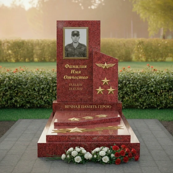 Особое внимание привлекает правая часть композиции, где изящно вырезан фрагмент, напоминающий развевающееся знамя или взлетающую птицу, словно символизируя вознесение души. Эта часть выполнена из камня с глубоким, насыщенным зеленым оттенком и имеет матовую, шероховатую фактуру, создающую благородный контраст с полированной чернотой. На ней расположены три объемные золотые звезды, символизирующие воинскую доблесть и заслуги, а также пара изящных, рельефных крыльев, будто готовых взмыть в небо. Эти элементы выполнены с потрясающей детализацией, каждый изгиб и линия проработаны с ювелирной точностью, придавая монументу особую выразительность и значимость.