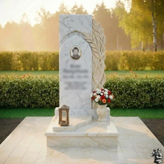 Центральная стела, выполненная в форме вертикального прямоугольника с выразительными асимметричными элементами, сразу привлекает внимание. Ее левая грань обработана с идеальной полировкой, создавая зеркальную поверхность, в которой отражается окружающий мир, символизируя бесконечность бытия. В верхней части стелы расположен изящный полумесяц со звездой, вырезанный с особой тщательностью, что придает памятнику глубокий религиозный смысл и подчеркивает индивидуальность усопшего. Ниже этого символа, в углублении, напоминающем стрельчатую арку, помещена овальная фотокерамика с портретом, обрамленная тонким рельефным кантом, что придает изображению особую значимость и защищенность.