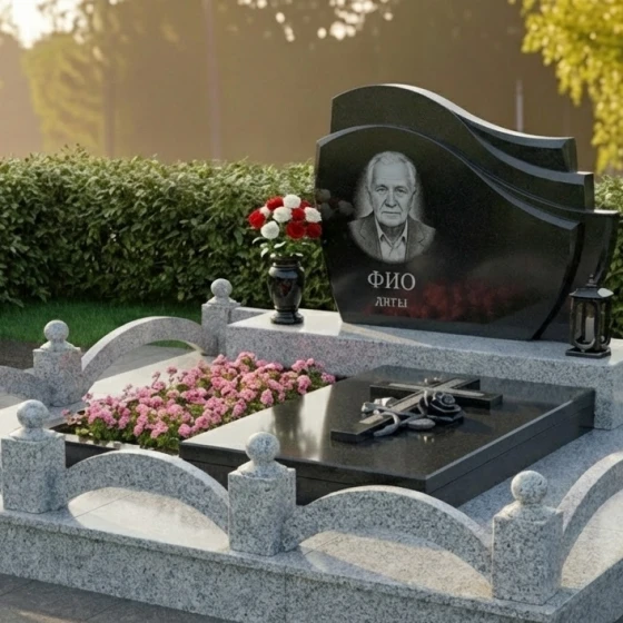 Оформление: Для этой формы стелы, напоминающей свиток, идеально подходит гравировка портрета в овальной или прямоугольной рамке, которая будет гармонично смотреться на фоне плавных изгибов. Рекомендуется использовать классические шрифты для ФИО и дат, чтобы сохранить строгий и достойный вид. Возможно добавление небольших символических элементов, таких как ветви, цветы или религиозные символы, которые будут деликатно вписаны в общую композицию, не нарушая ее гармонии.