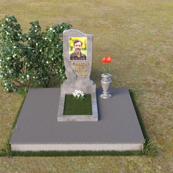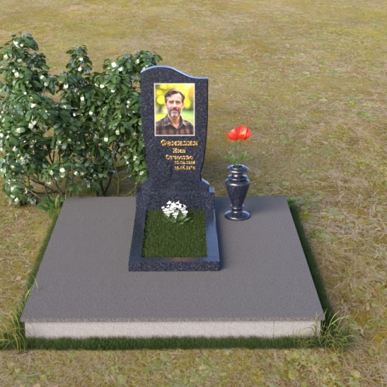 Величественная стела памятника ПВ 015 выполнена в строгой, но элегантной форме. Верхняя часть памятника имеет плавный, волнообразный силуэт, что придает ему мягкость и изящество. Сглаженные углы и отсутствие острых граней создают ощущение покоя и умиротворения. Боковые грани стелы слегка скошены, что визуально облегчает конструкцию и добавляет ей динамичности. Фаска, обрамляющая верхнюю часть памятника, подчеркивает его контур и придает завершенность образу. Нижняя часть стелы, переходящая в тумбу, имеет строгую прямоугольную форму, обеспечивая устойчивость и надежность всей конструкции. Зеркальная полировка поверхности камня отражает окружающий мир, создавая ощущение глубины и света. На стеле располагается портрет усопшего, выполненный с высокой точностью и детализацией, а также памятная надпись, нанесенная золотыми буквами.